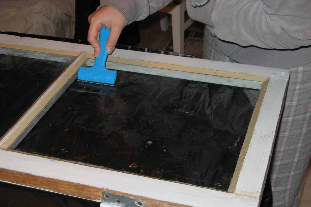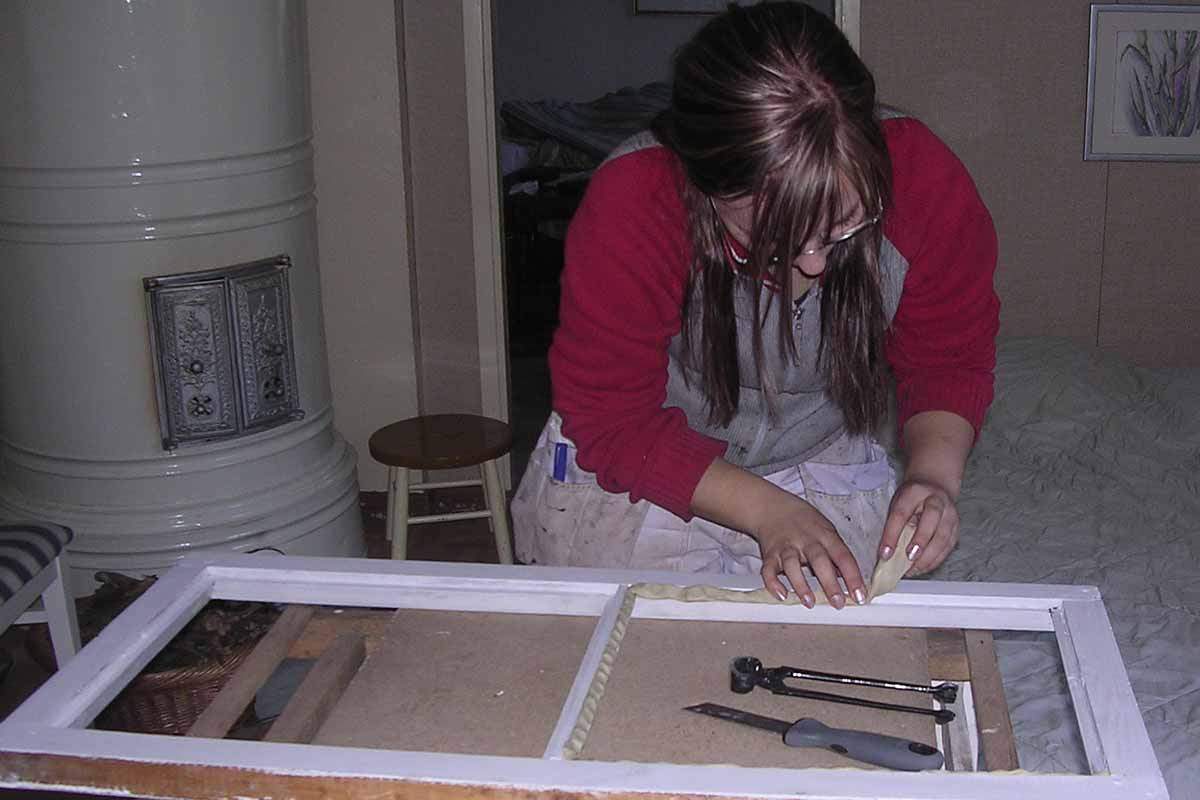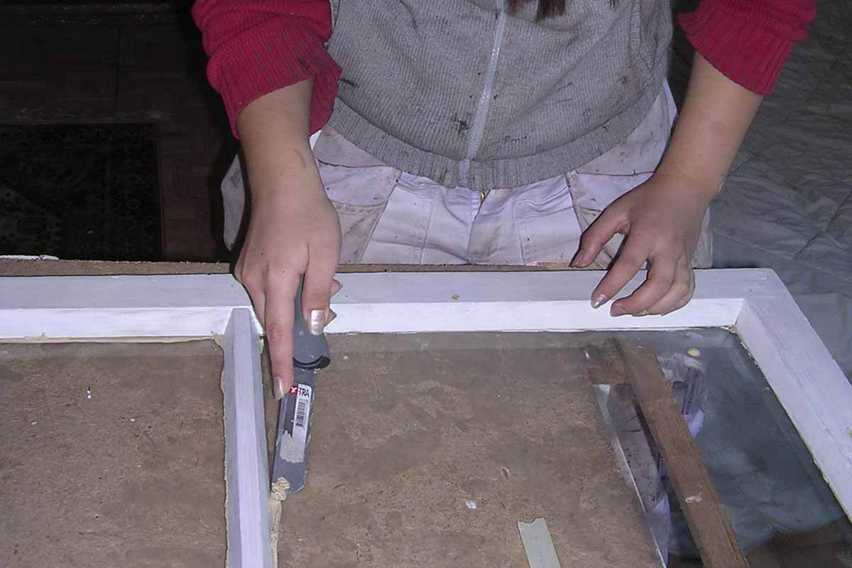 Maalien kuivuttua laitettiin oksalakattuihin reunasyvennyksiin ohut kittikerros, ja ikkunat asetettiin takaisin. Ikkunat kiinnitettiin pienillä lasituslankanauloilla, joita sai taittamalla sellaiset pitkästä lasituslangasta.