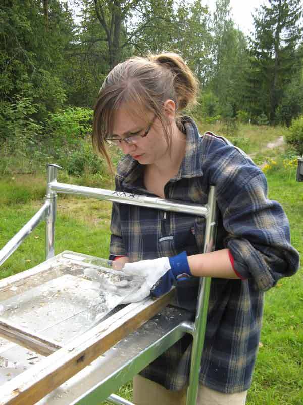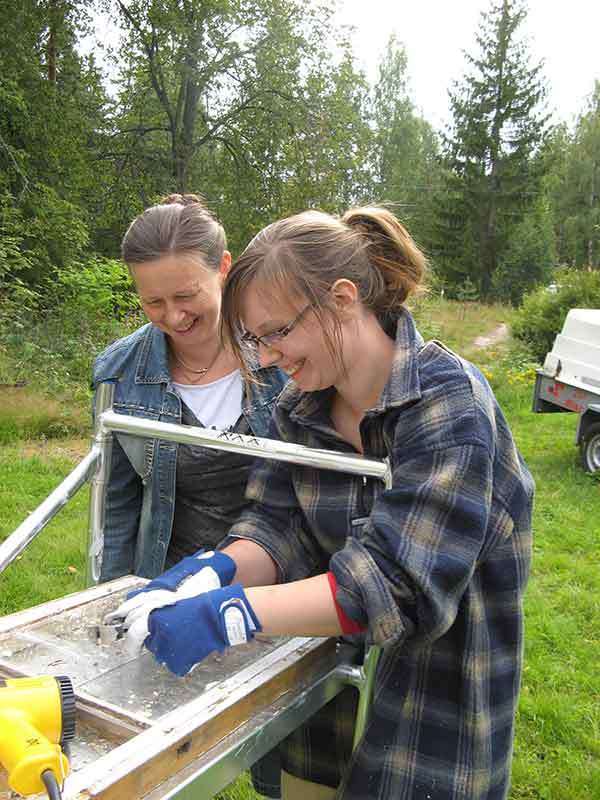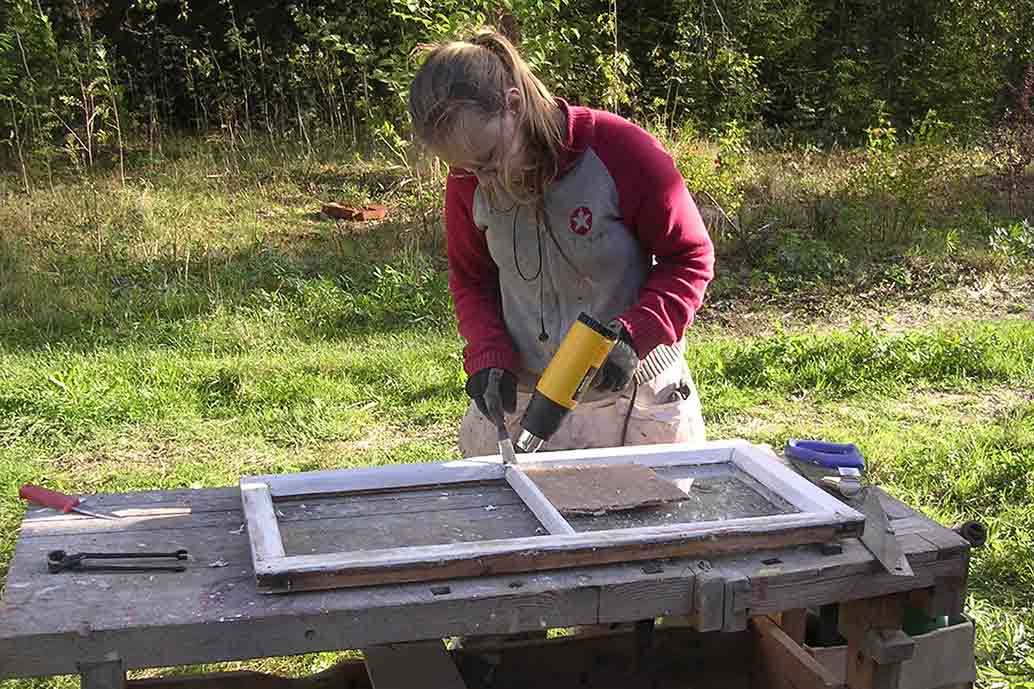 Jouduimme hankkimaan lisää puhallettua lasia, koska osa laseista oli rikki ja niitä jouduttiin vaihtamaan. Löysin niitä yllättäen talon pihalta, ne olivat osaksi maahan kätkeytyneenä. Lasit olivat suurelta osin vielä käyttökelpoisia puhdistuksen jälkeen. Osan laseista saimme Metsäkylän Navetasta Hämeenlinnasta.