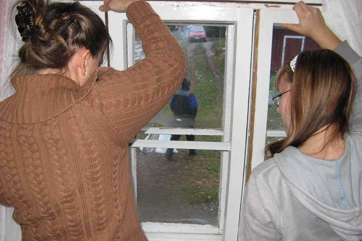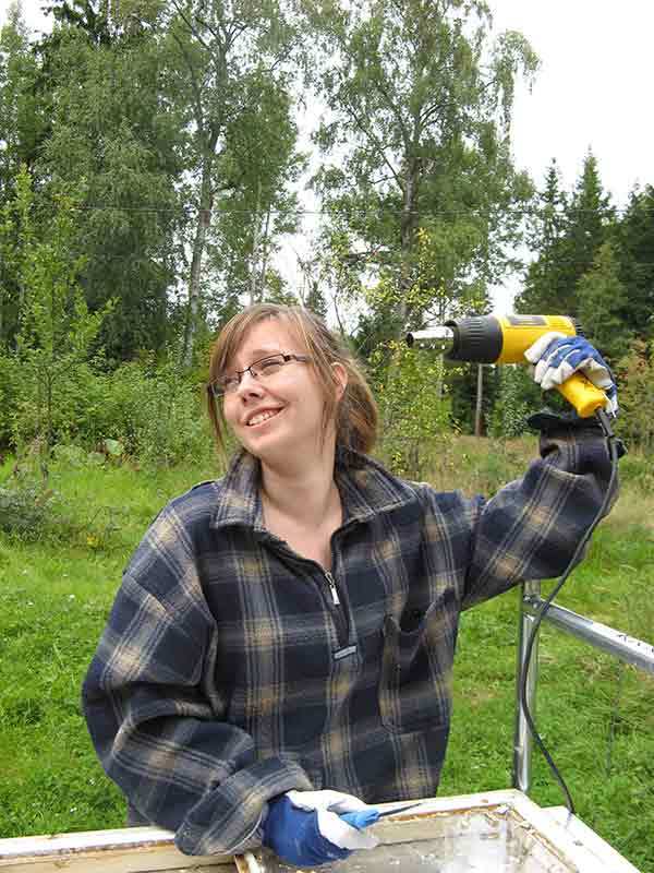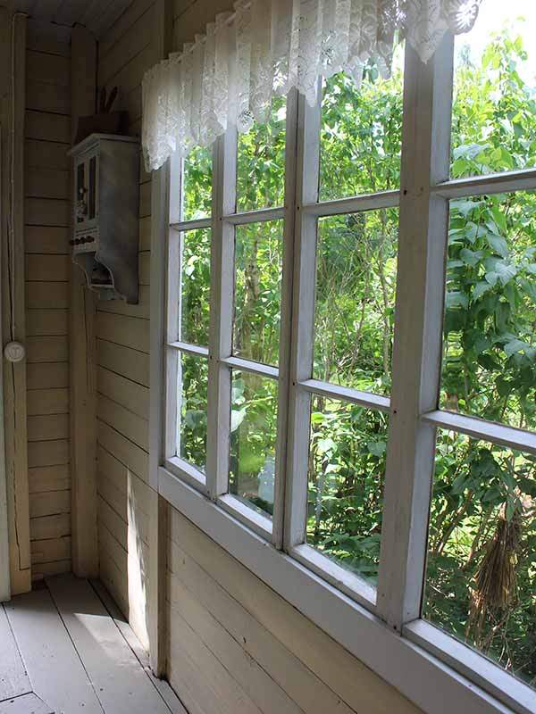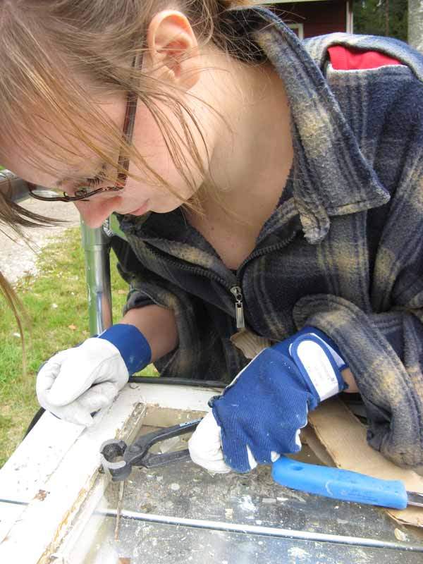 Meidän talosta oli ollut joku muukin kiinnostunut ennen meidän tuloa sinne. Myynnissä olevaan taloon oli yritetty tulla eteisen sivuikkunasta. Se oli rikottu ja ikkunan välipuu oli sahattu poikki. Tällaista puuosien korjausta emme itse alkaneet tehdä, mutta löysimme ammattitaitoisen tekijän Porvoosta korjaamaan ikkunan. Hänellä oli puhallettua lasia, ja hyvät laitteet sen katkaisemiseksi. Kittien pehmittämiseen oli hyvä kone ja kaikki sujui näppärästi.