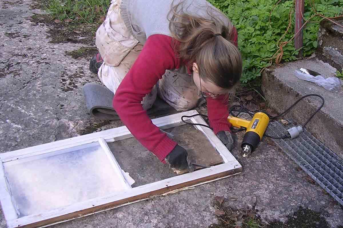 Täydellisessä ikkunoiden kunnostuksessa jouduttiin tekemään pohjatöitä, joista ensimmäinen oli ikkunakittien poistaminen. Vanhojen ikkunakittien poistamista varten kitti piti pehmittää. Pehmittämiseen olisi tarvittu infrapunalämmitin, mutta sen voi korvata lämpöpuhaltimellakin, jos suojaa ikkunan pistemäisen kuumenemisen. Silloin ikkuna ei rikkoudu.
