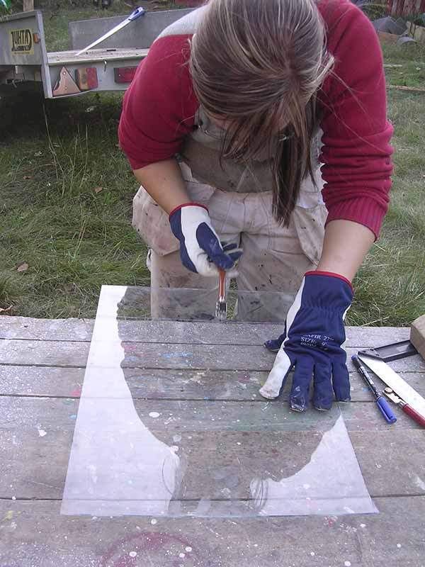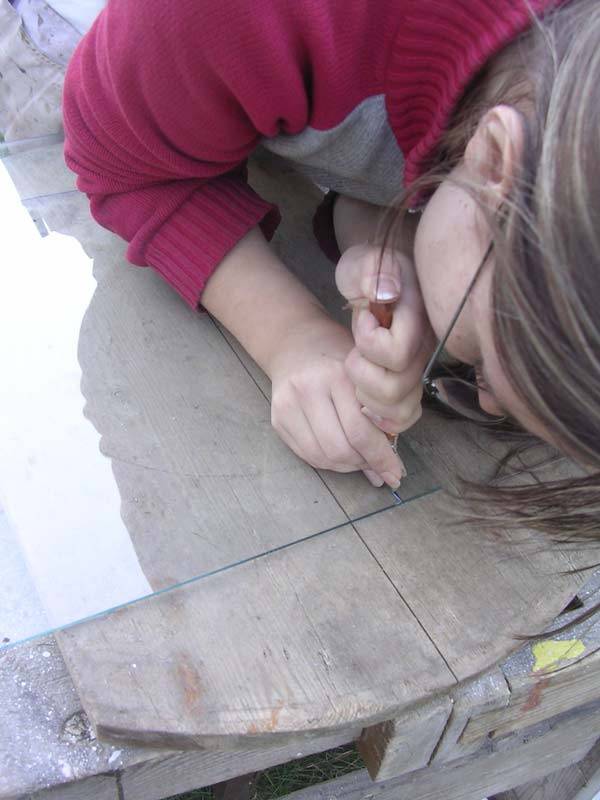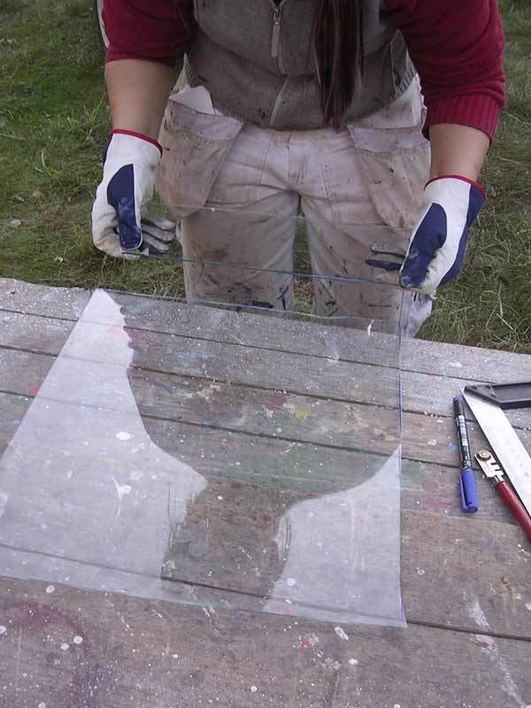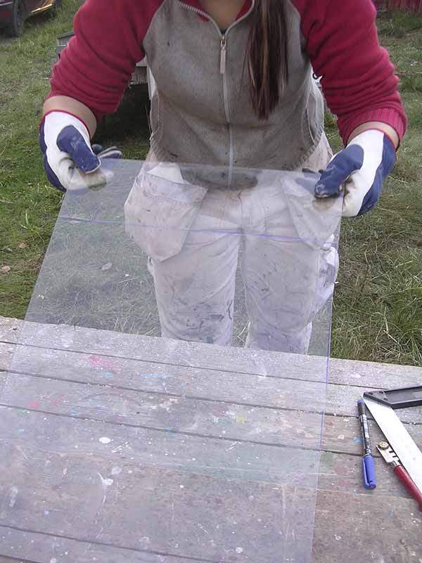 Puhallettu lasi on elävää, siinä voi olla ilmakupliakin, mikä tekee lasien leikkaamisesta haastavan työn. Vaihdettavia ruutuja oli sen verran, että hankimme myöhemmin lainaksi ison leikkurin, joka takasi onnistumisen.