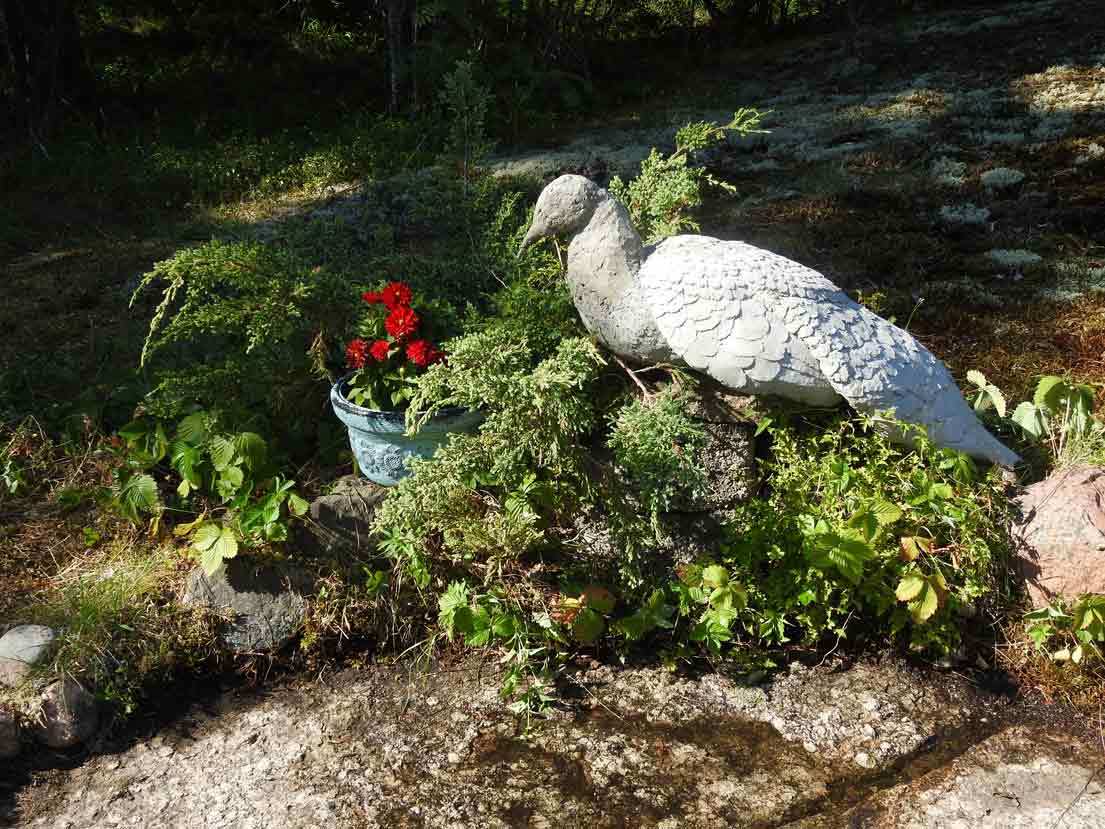 Jouduimme välillä lähtemään kaupunkiin ja betonilintu jäi kuivumaan pihalle. Tuli muita kiireitä, eikä riikinkukon viimeinen silaus edennyt aikataulun mukaisesti. Silloin päätin, että kukko on nyt valmis, kuten edellinenkin, ilman hienosäätöä. Kannoin isännän kanssa riikinkukon paikalleen kivien päälle, ja se sopi siihen juuri sellaisenaan. Kun Heidi tuli seuraavan kerran paikalle, hän antoi taas periksi päätökselleni, ja niin viimeistely jäi hamaan tulevaisuuteen.