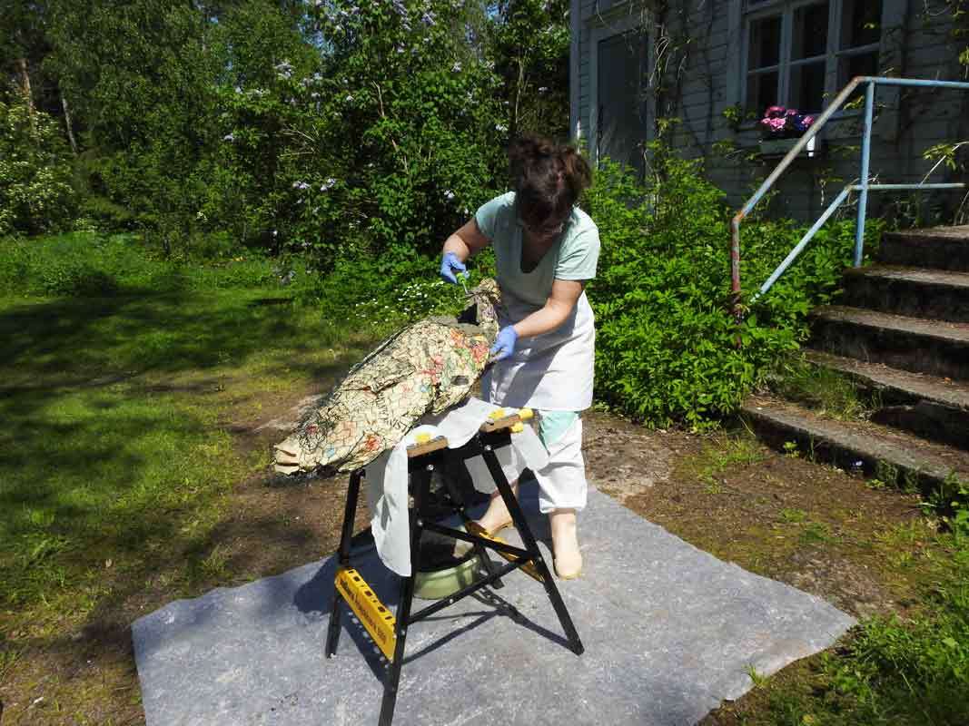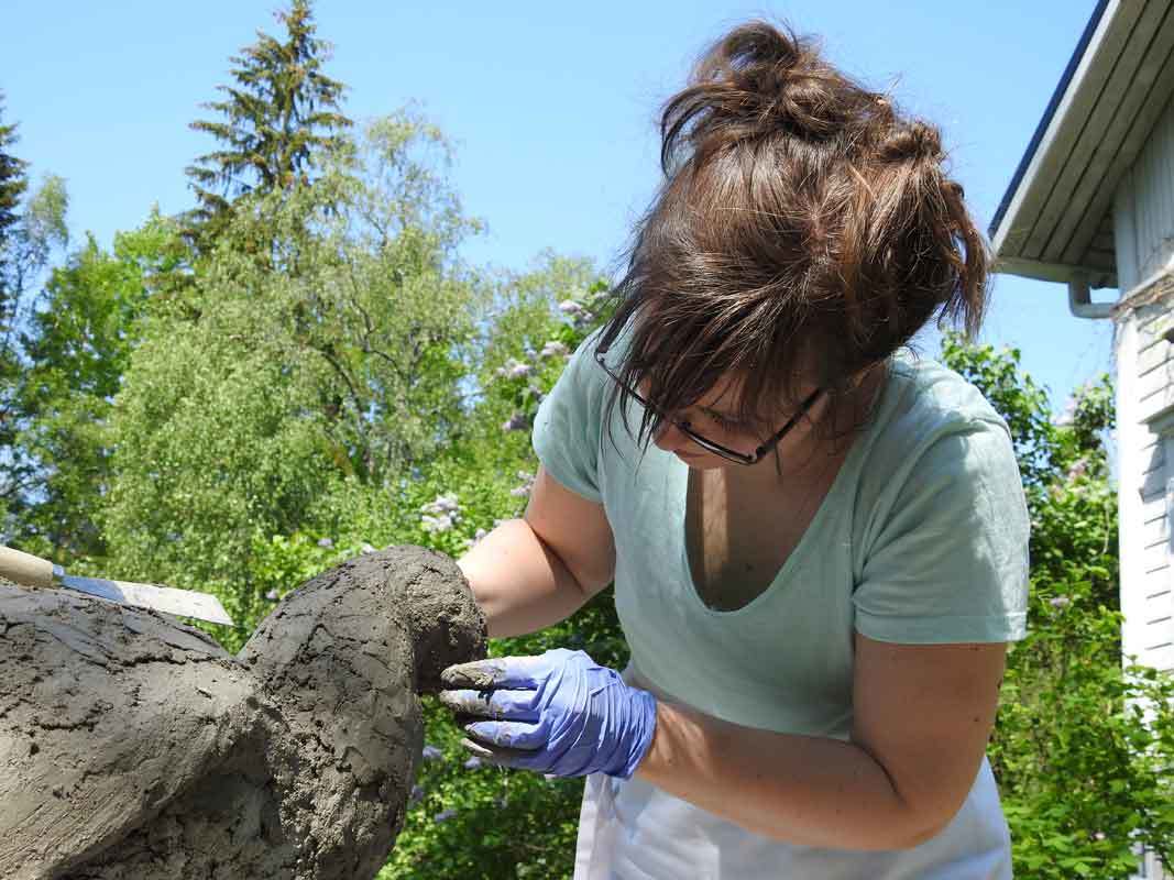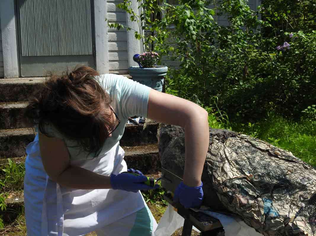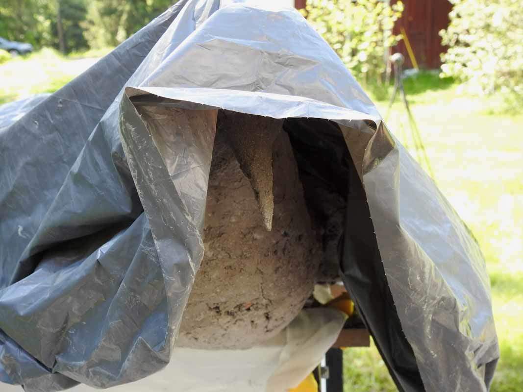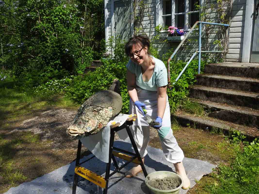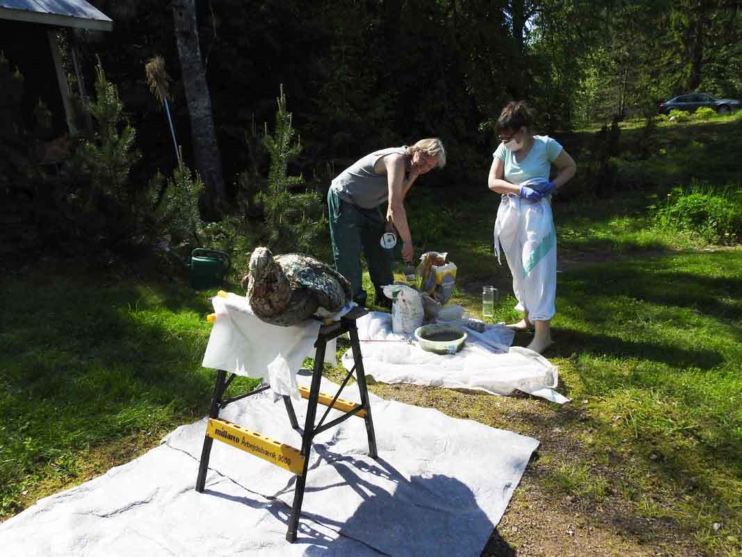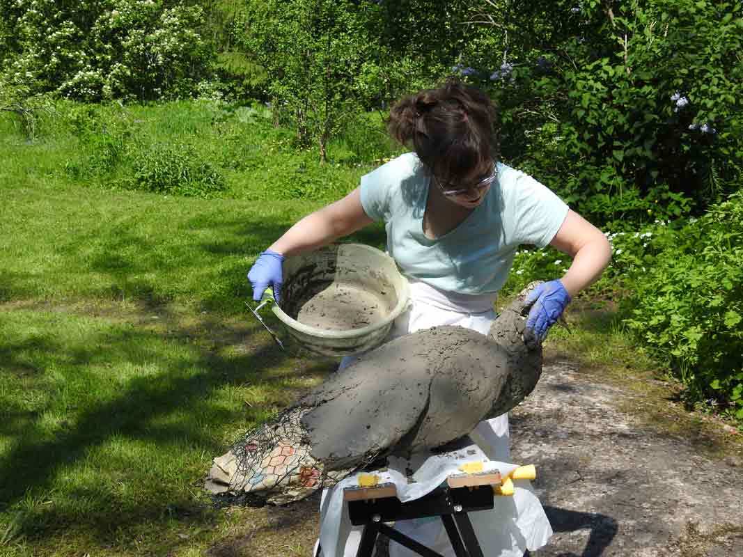 Linnun toiseen kerrokseen Heidi päätti tehdä varmuuden vuoksi vähän erilaisen seoksen, sen pitäisi ainakin olla säänkestävää. Tässä käytettiin sementtilaastia kuivabetonin sijaan, ja massasta tuli hienompaa. Tällä kertaa tekeminen aloitettiin pyrstöstä.