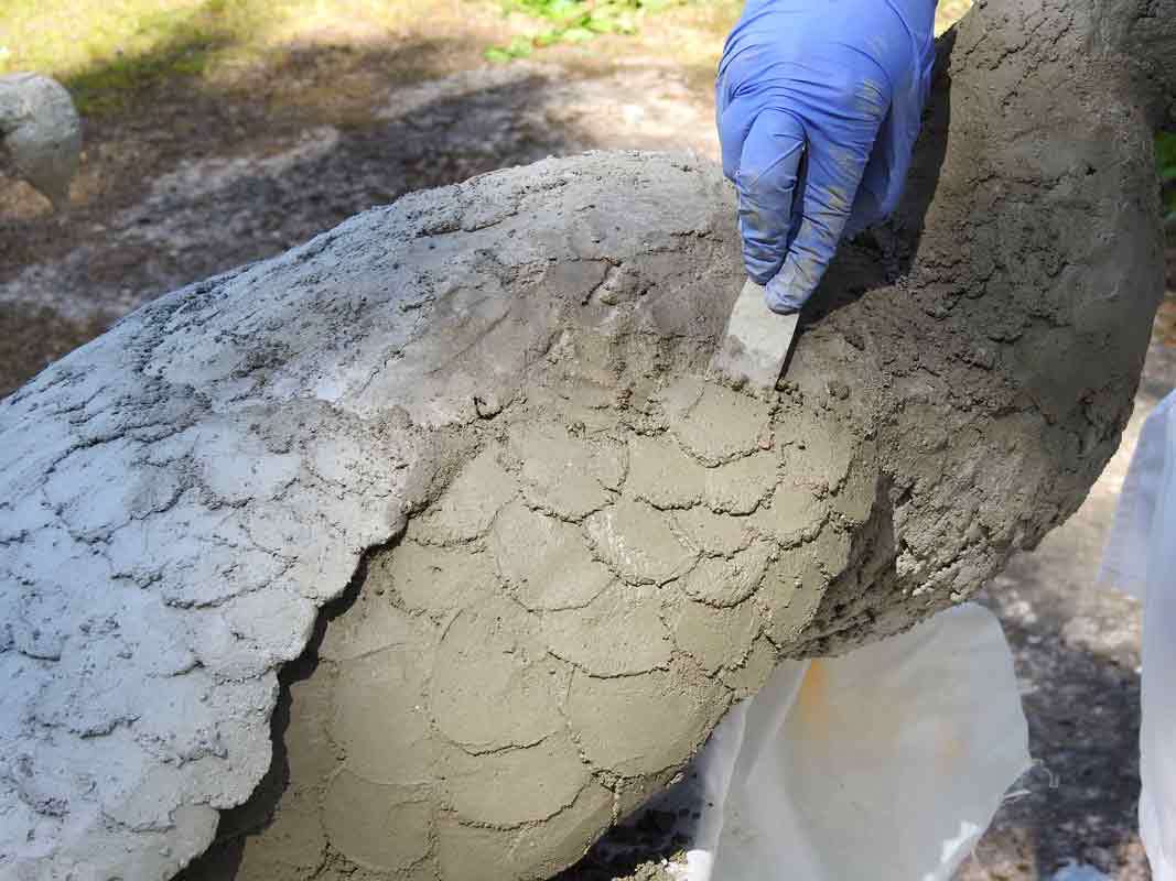 Riikinkukon vatsapuoli tehtiin ensin, ja sen annettiin kovettua yön yli kosteana pussin alla. Aamulla lintu käännettiin, eikä se hajonnut. Nyt voitiin aloittaa selkäpuolen, kaulan ja pään tekeminen. Massaa jouduttiin aina välillä valmistamaan lisää, koska se oli käyttökelpoista vain määrätyn ajan. Heidi lisäsi betonimassaa laastilapiolla, veistellä ja välillä käsinkin (on muistettava käyttää läpäisemättömiä käsineitä) saadakseen riikinkukon pohjakerroksen selälle sekä kylkiin, ja viimein kaulan sekä pään alueelle. Pinta jätettiin karkeaksi, jotta siihen kiinnittyisi hyvin seuraava kerros. Vähitellen ensimmäinen kerros alkoi muodostua betonilinnuksi.