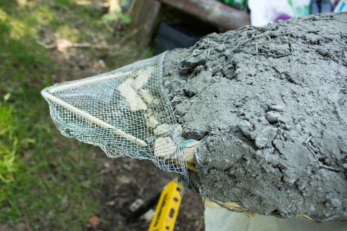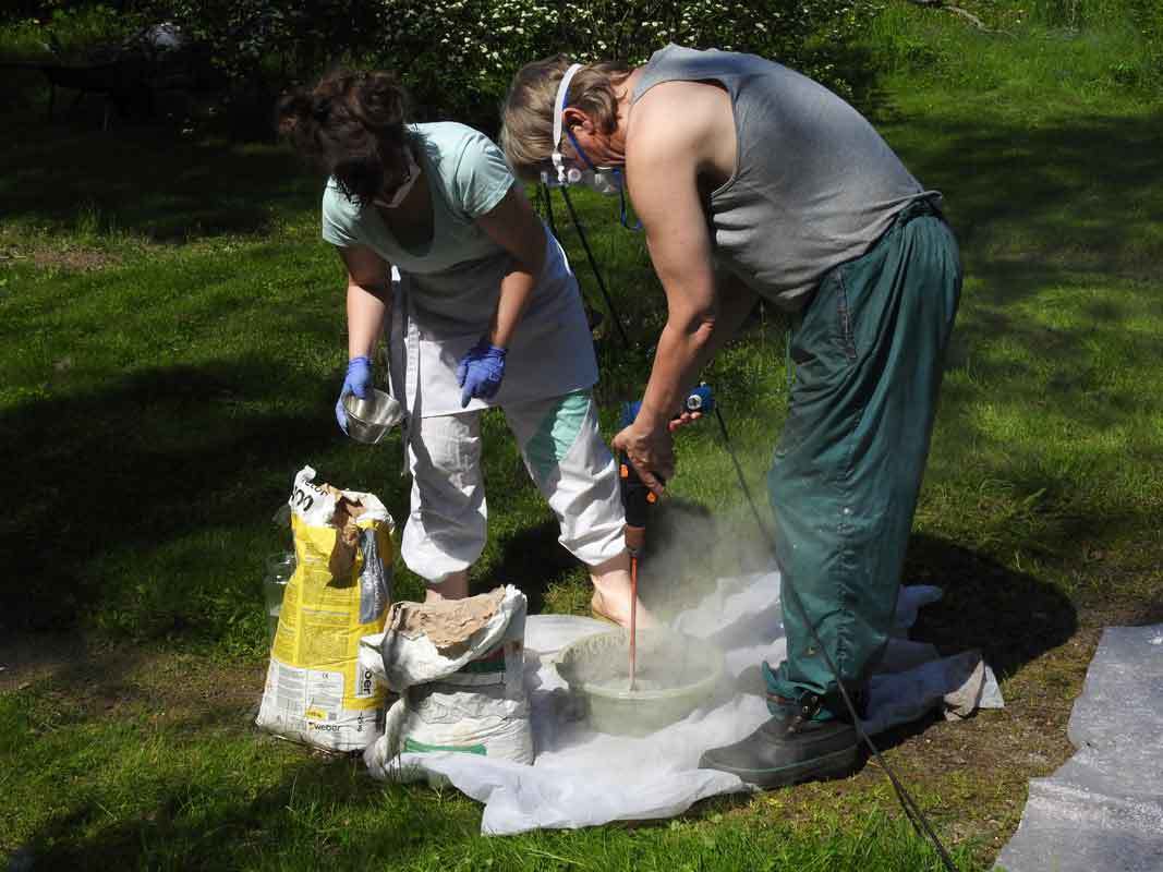 Betonimassan sekoittamiseen tarvittiin sanko ja pora, jossa oli sekoitin päässä. Veden lisäksi seokseen lisättiin kuivabetonia, ja lattiatasoitetta sekä vähän saumauslaastiakin. Talon isäntä auttoi betonimassan tekemisessä. Emme löytäneet enää reseptiä edellisen linnun seoksen koostumuksesta. Muistelimme yhdessä, mitä siihen laitettiin, mutta varmaa ei ole, onko massa missään määrin samanlaista kuin edellinen. Toivon mukaan se on kuitenkin säänkestävää!