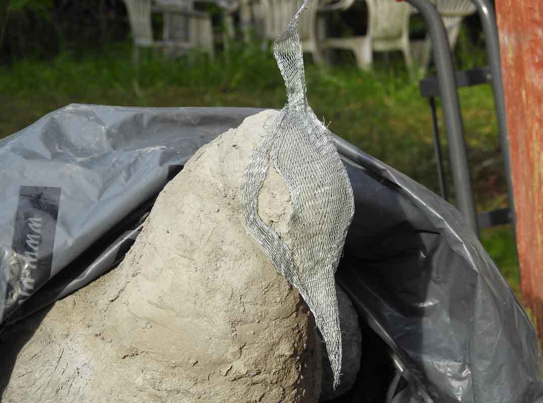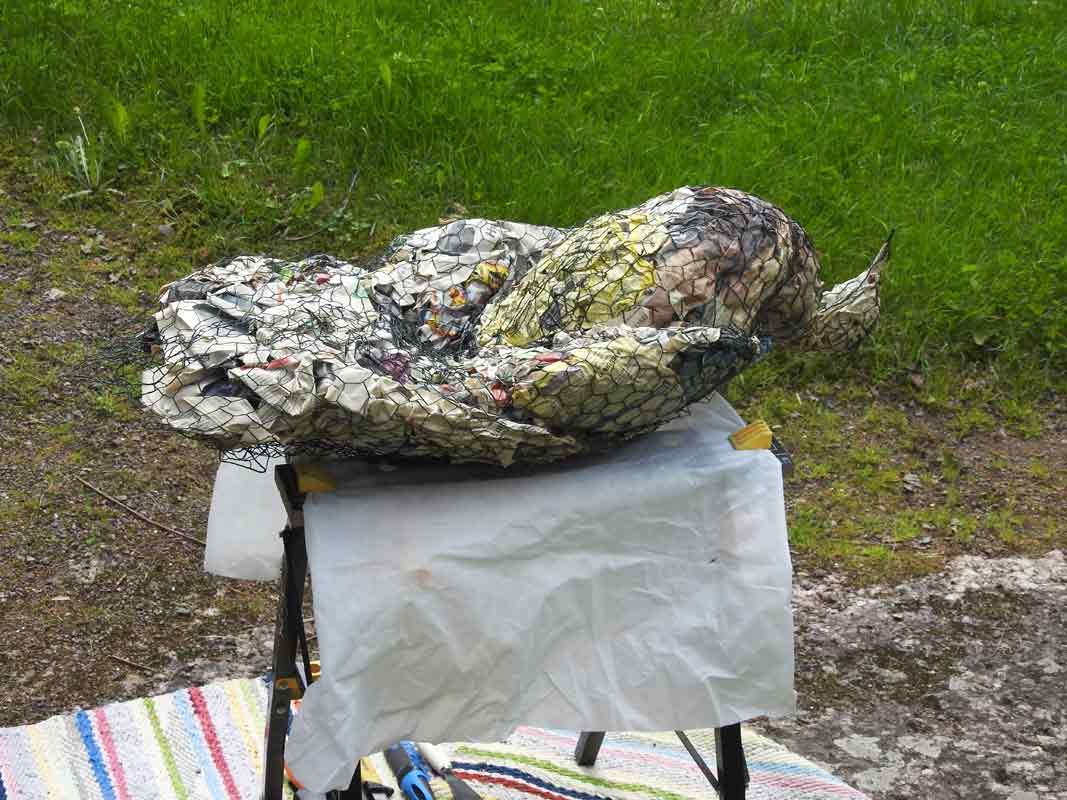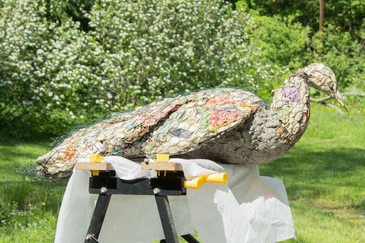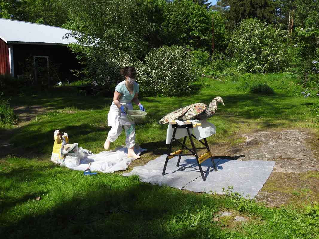 Oli aika nostaa vajasta esiin työpöytä, jonka päälle kanaverkosta ja sanomalehdistä tehty riikinkukon aihio asetettiin selälleen. Myös aiemmin tehty betonilintu oli mukana työpaikalla muistuttamassa, minkä tyylinen lintu voisi olla. Nehän tulisivat olemaan lähellä toisiaan pihassa.