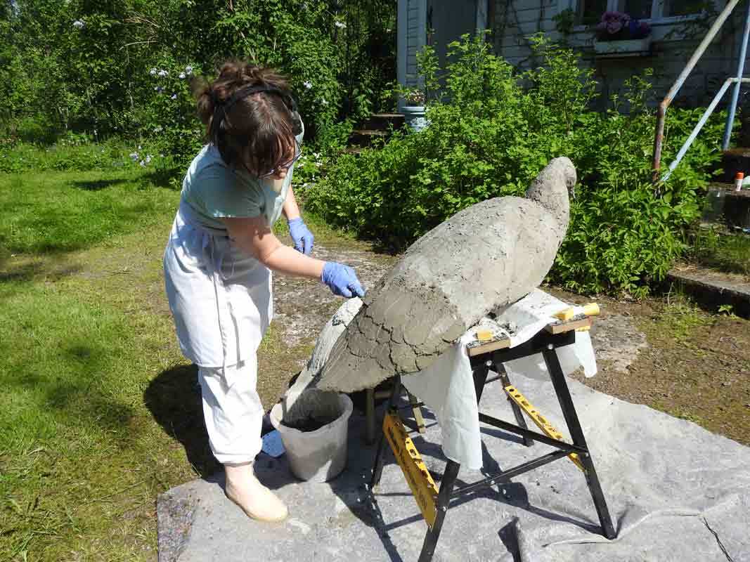 Olin ostanut joskus M. Skoten kirja Betoni, hauska harrastus, Tee esineitä pihalle ja mökille. Siitä saatiin jonkin verran tietoa betonin työstöön. Sen mukaan betonissa oleva vesimäärä vaikuttaa betonin väriin. Sitä Heidi ei muistanut, mutta linnun kohdalla tämä efekti toimi meidän hyväksi. Vaihtelu antoi linnulle elävyyttä. Internetistä saa myös monenlaisia pikku niksejä, ja onnistumisprosentti kasvaa, kun laastipussien kyljestä olevia ohjeita noudattaa. Omana ohjeena voimme sanoa myös, että jos tehdään eri kerroksia teokseen, täytyy ensimmäinen betonikerros jättää karkeaksi ja pitää työ koko ajan kosteana, jotta seuraava kerros tarttuu siihen paremmin. Betoni ei saa myöskään kuivua liian nopeasti valmistuttuaan.