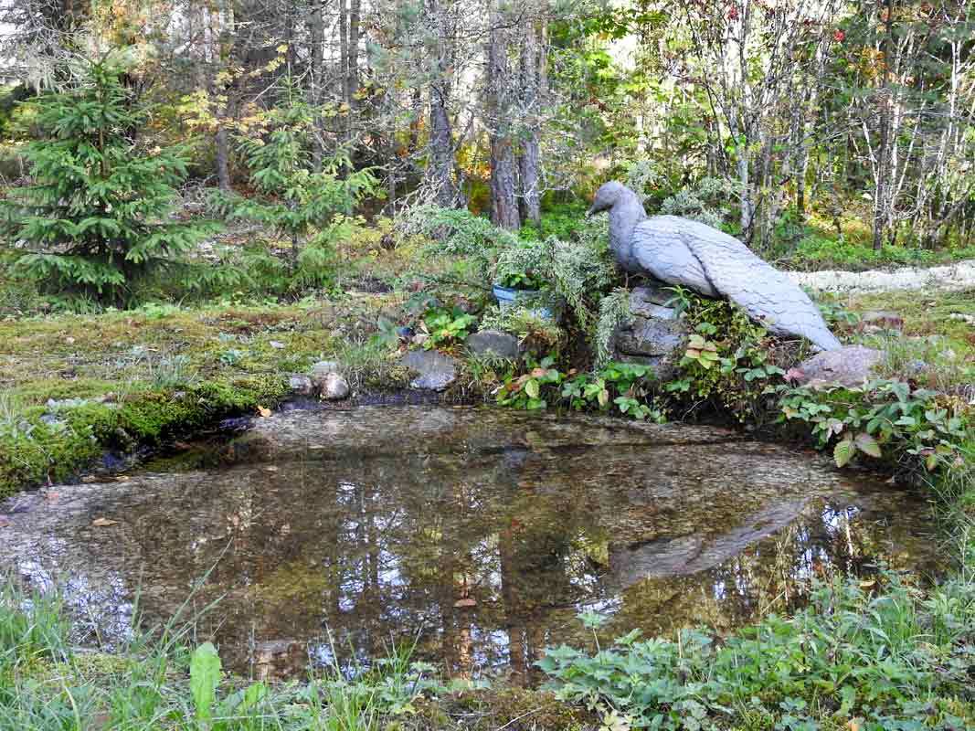 Betonilintu lammikon reunalle