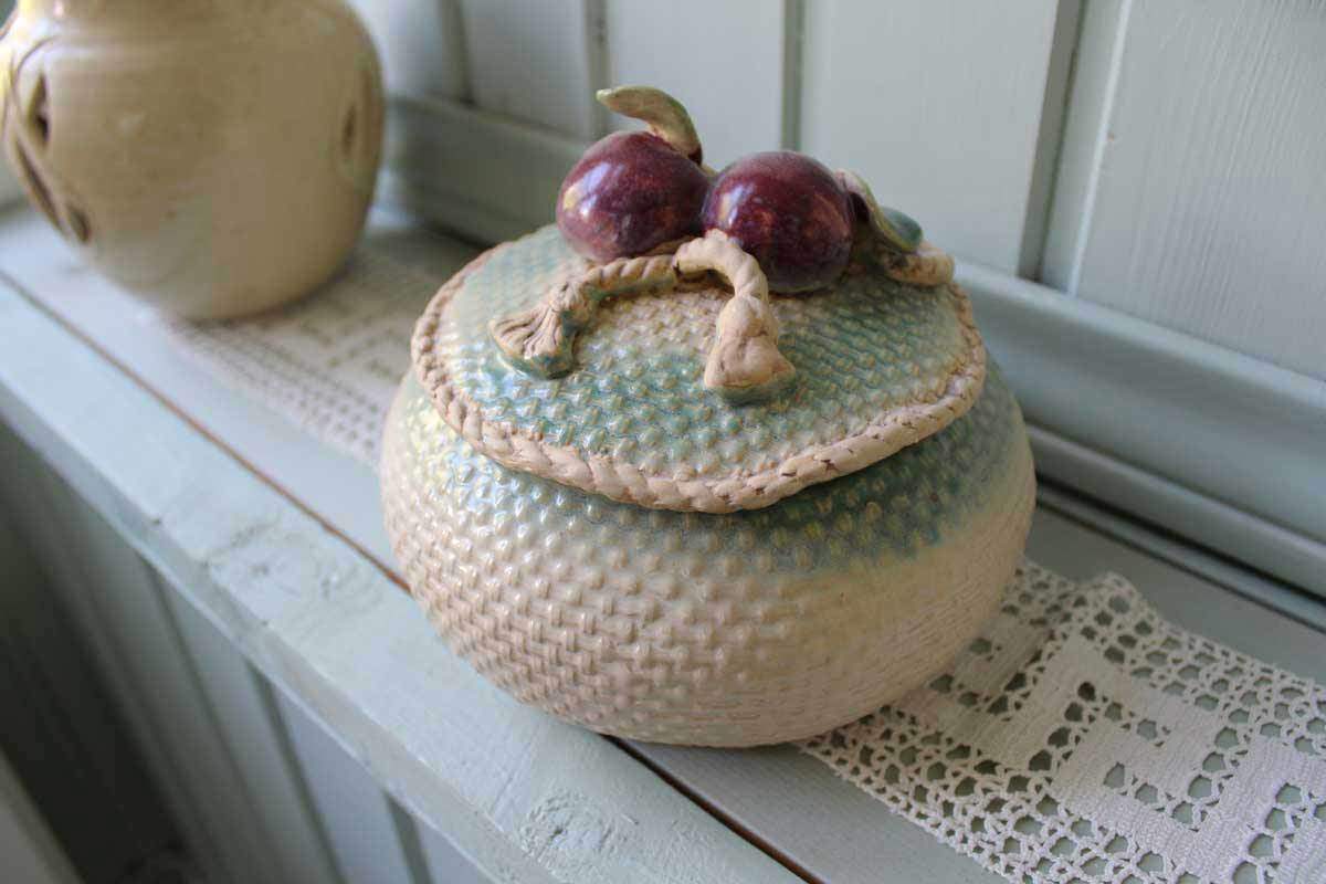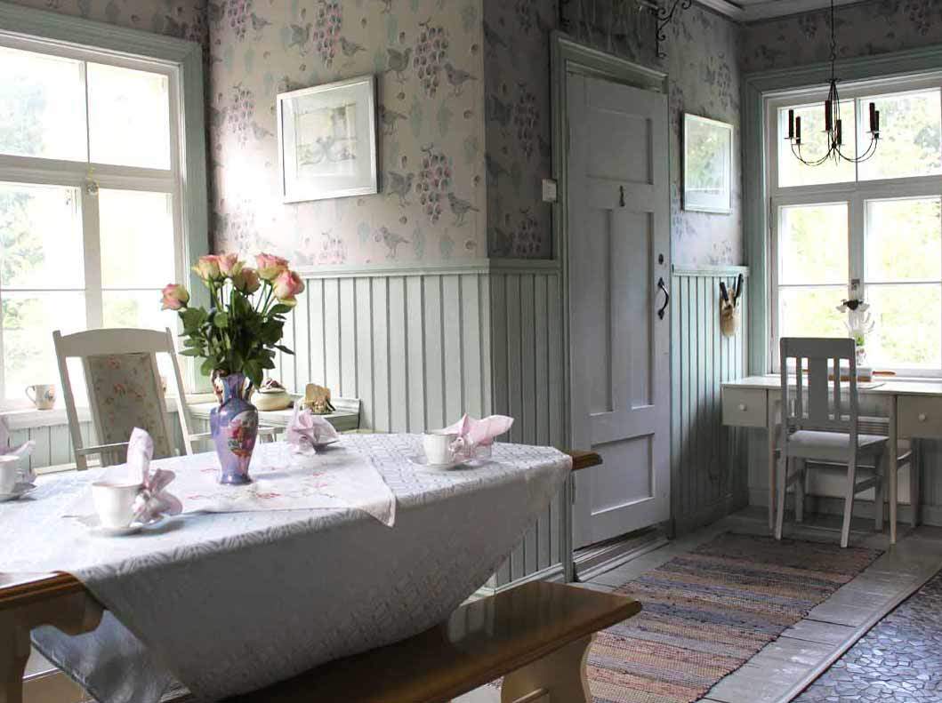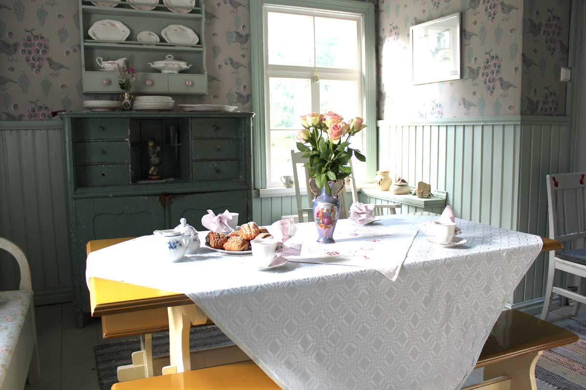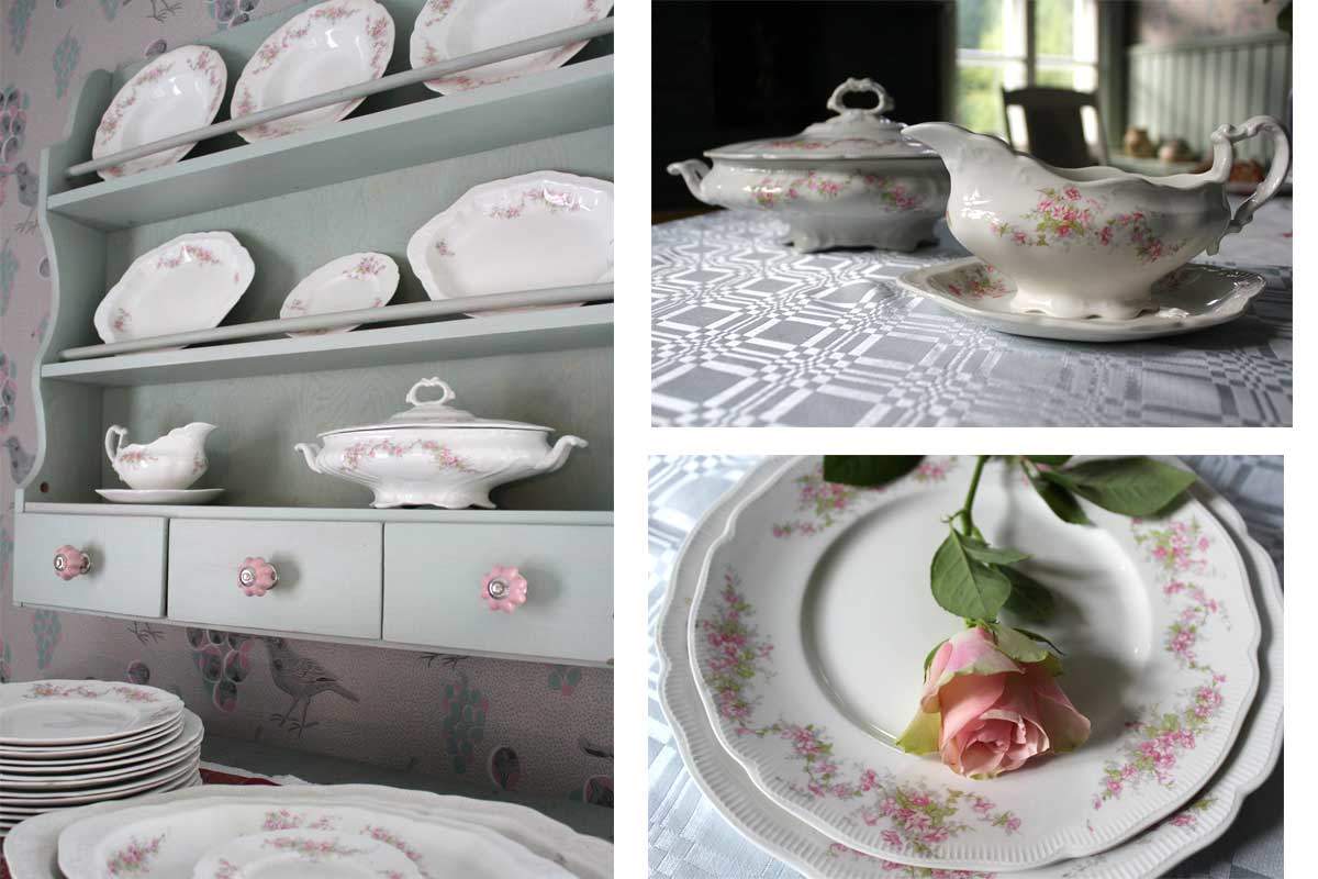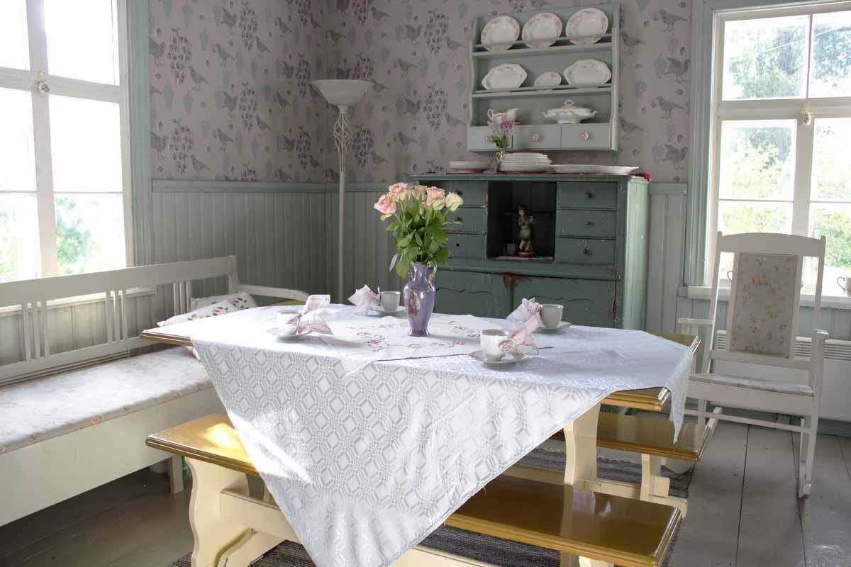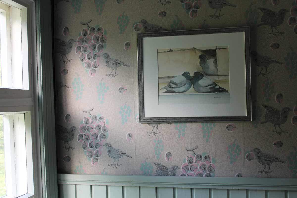 Nyt valittu tapetti ei paljon tauluja kaipaa, mutta koska olen tehnyt paljon akvarelleja, päätin tehdä pari tilaan sopivaa lintutaulua, jotka antavat pientä lisäilmettä tupaan. Pikku purkin ja kupit löysin kirpputorilta, ja aivan kuin samaan sarjaan kuuluvana sain lahjaksi myös saviastioita. Erään kerran näin kirpputorilla ihanan vanhan ruoka-astiaston, joka oli aivan pakko hankkia kunnostettuun tupaan. Olen sijoittanut astiat seinällä olevaan astiahyllyyn ja vihreän kaapin päälle loput.