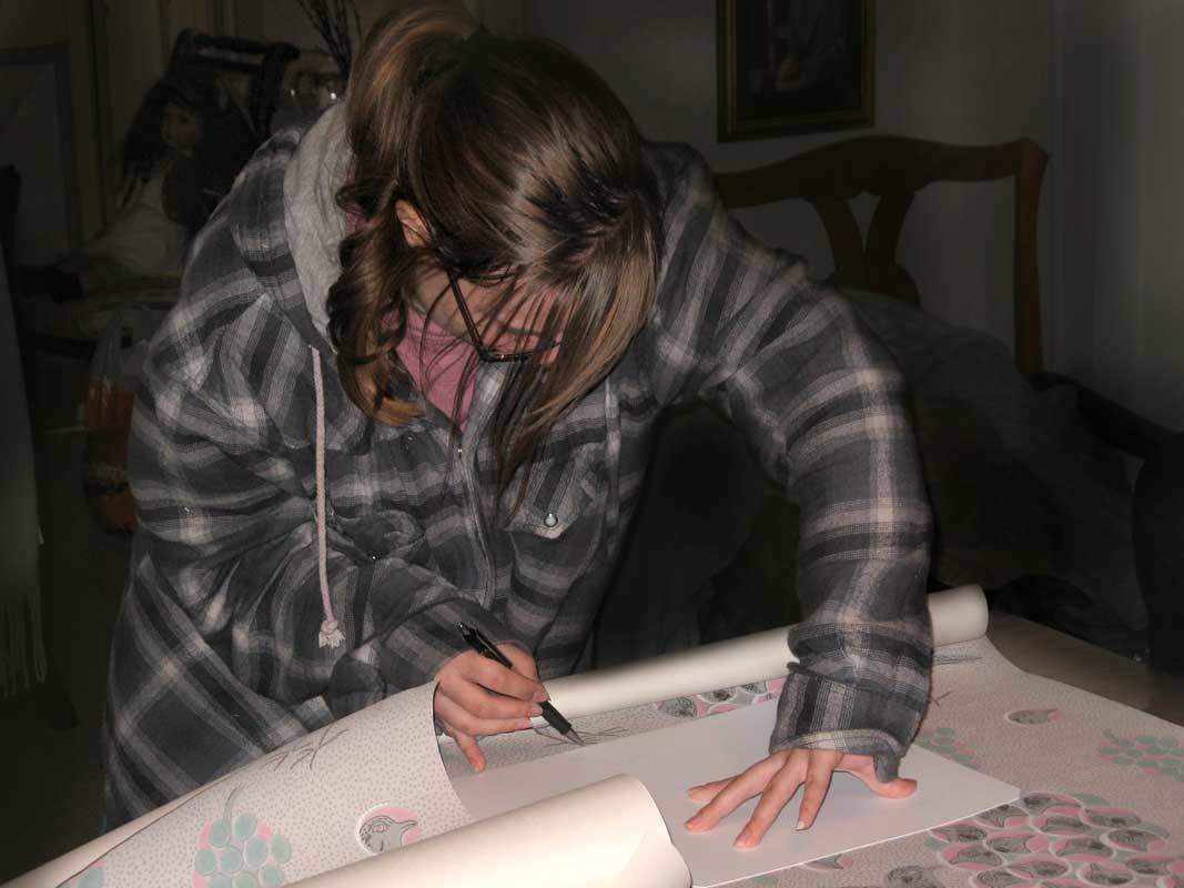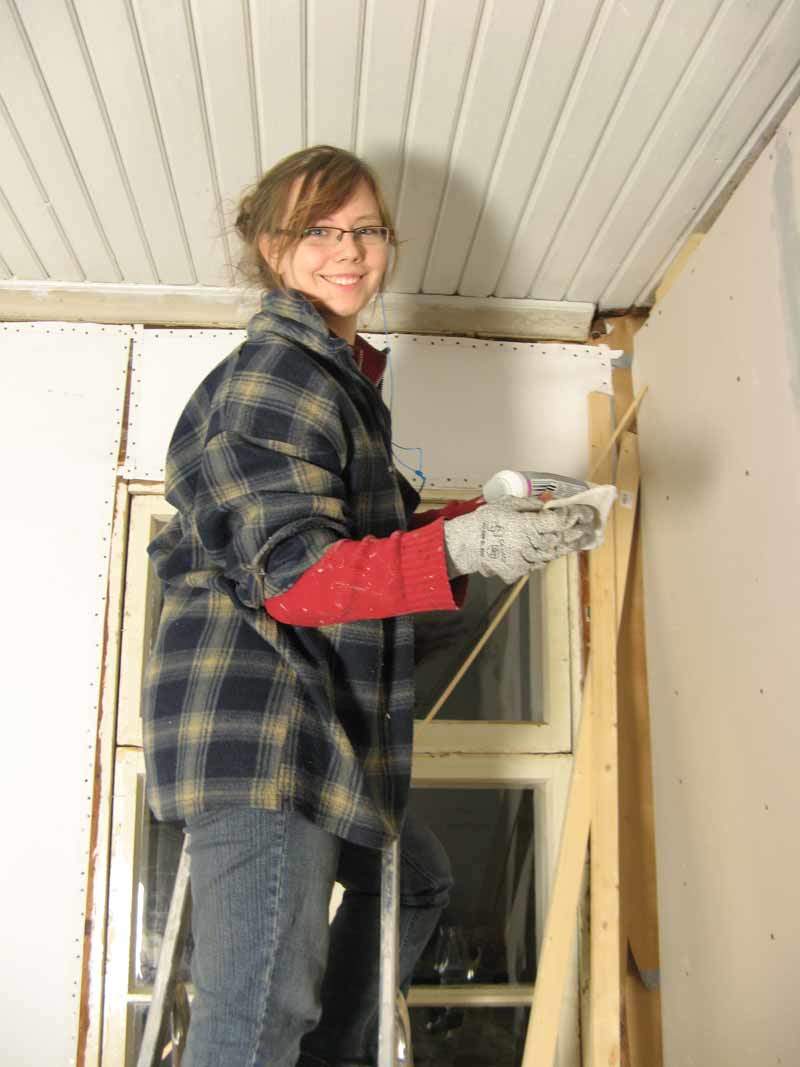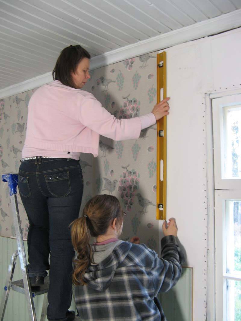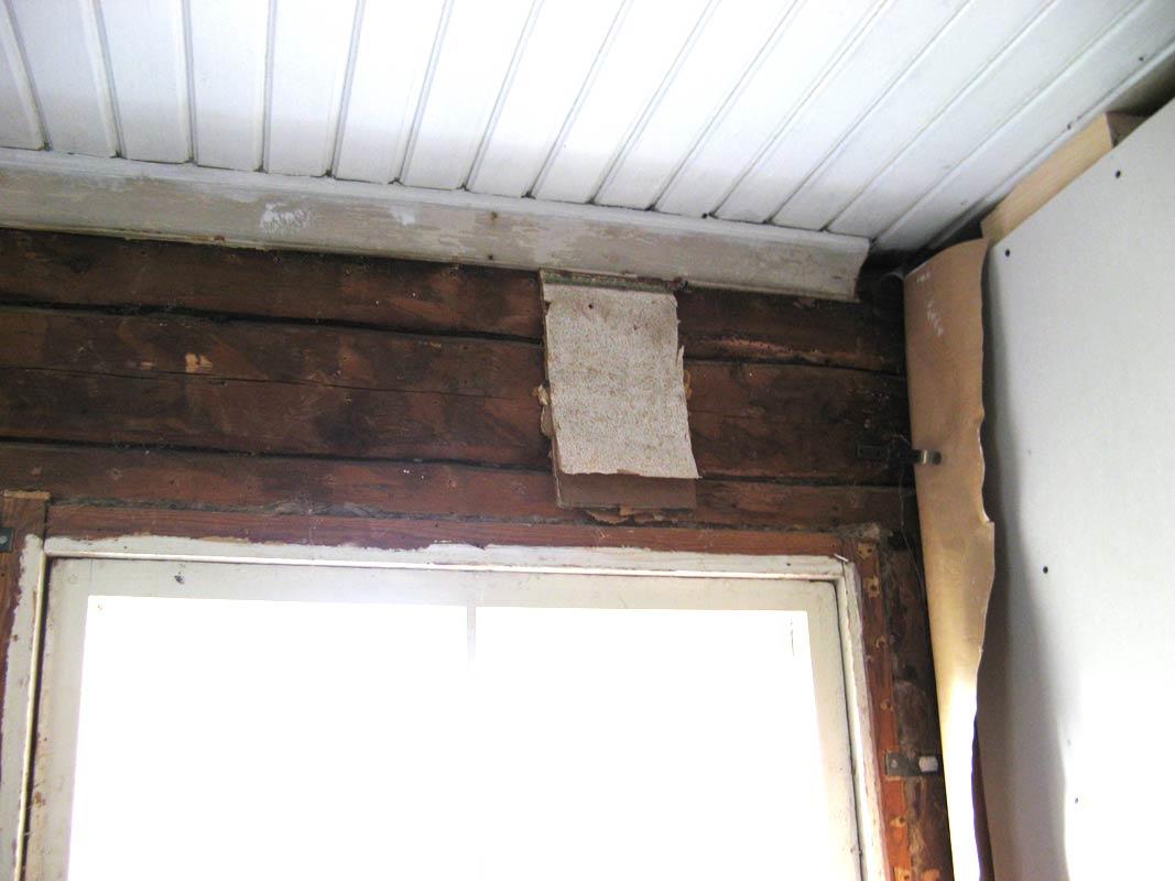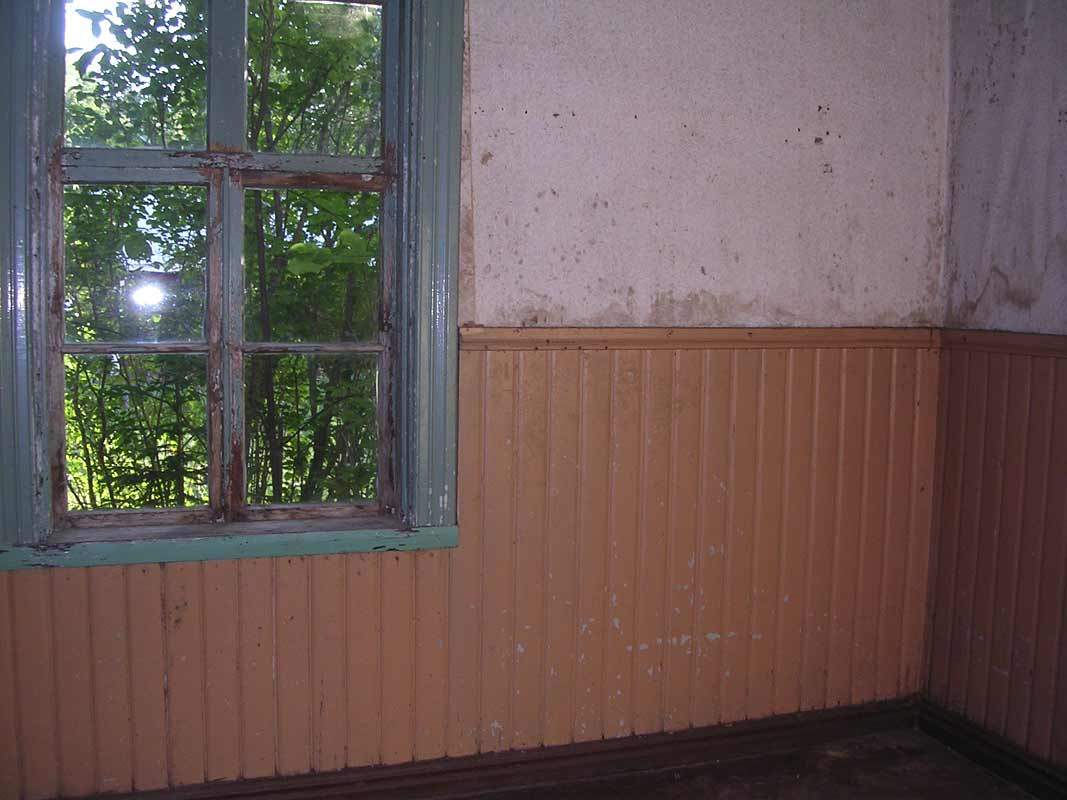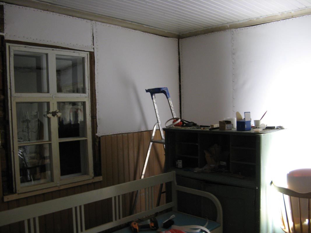 Huoneen seinissä oli ollut ruskeasävyiset puolipaneelit ja yläosassa pinkopahvit, jotka vaikuttivat huonoksi menneiltä kylmän ja kosteuden vuoksi. Poistimme seinistä puolipaneelit ja pinkopahvit, jätimme ainoastaan fragmentit eri tapettikerroksista. Otimme säilöön myös ison palan pinkopahvia tapetteineen talon historian säilymiseksi. Sitten tilkitsimme pellavarivettä käyttäen nurkat, lattian ja seinän väliset sekä muut raot, josta voisi vetää talvella. Korjasimme lahonneet puuosat. Lahon kohdan voi todeta mm. käyttämällä puukkoa tai naulaa apuna. Jos terä uppoaa puuhun, voi korjauksen tehdä paikallisesti vain huonoksi menneisiin kohtiin.