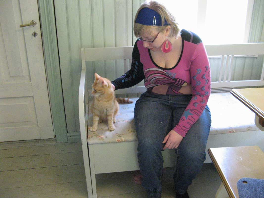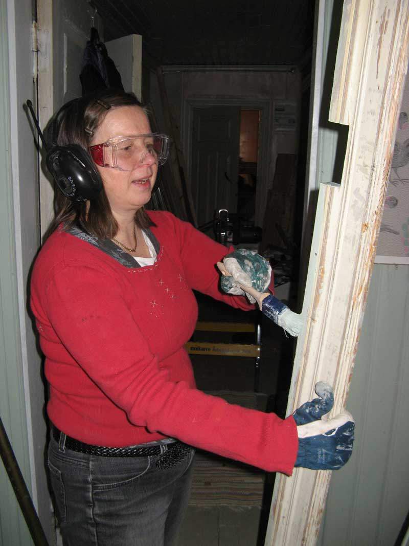 Ulkoeteiseen menevä ovi hohkasi kylmää, joten kehittelimme talon isännän kanssa karmiin uudet urat, johon mahtui vajasta löytämämme vanha sisäovi juuri sopivasti – tai ainakin melkein sopivasti. Ehkä tarvitsisimme kokonaan uudet ovet, mikäli olisi oltava täysin tiiviit ovet. Vanhaan taloon sallitaan hiukan enemmän lämmönhukkaa kuin uusissa taloissa. Tupakeittiössämme olikin monta ovea. Ulko-oven lisäksi yksi ovi vei sisäeteiseen, yksi siniseen olohuoneeseen ja yksi ovi WC/kylpyhuonetilaan. Siihen sovitimme entisen saunaneteisen oven. Hioin kahdesta valkoisesta ovesta vain pinnat ja maalasin ne pellavaöljymaalilla valkoiseksi. Kolme ovista oli ollut väriltään vihreitä, joten sain apua myös talon isännältä hionnassa. Silloin käytettiinkin sitten jo taso- ja kulmahiomakonetta. Kittasin pahimmat koloset ovista ja maalasin nekin sitten valkoisella pellavaöljymaalilla. Ovilistat maalasin samalla vihreällä kuin paneelitkin. Ovista huomaa, että ne ovat vanhoja, mutta niin niiden kuuluukin olla. On tärkeätä säilyttää vanhan ajan tunnelma, josta niin nautimme. Tupakeittiö jo sinällään sopii vanhaan hirsitaloon.