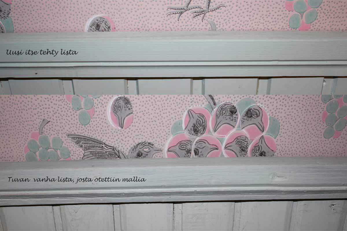 Lankkulattiat maalattiin samalla harmaalla kuin oli muissakin huoneissa maalattu. Uuteen WC/kylpyhuoneseinään tarvittiin profiililtaan samanlaista lattialistaa kuin muussakin osassa huonetta. Leveää lattialistaa löytyi Metsäkylän Navetasta, ja sieltä löytyi myös ovilistaa, jota puuttui sekä WC/kylpyhuoneen oven ympäriltä että oven, joka oli otettu esiin kunnostuksen aikana olohuoneen ja tupakeittiön välistä.