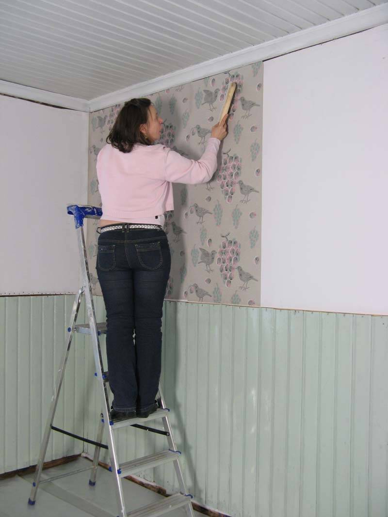 Seuraavaksi olisi vuorossa tapetointi. Sitä emme olleetkaan tähän mennessä tehneet, koska aiemmin meillä pinkopahvit ja seinät oli maalattu. Tässä tulevassa tupakeittiössämme tuli olemaan yläosassa tapetit ja alaosassa puolipaneelit kuten aikaisemminkin. Tapettien valitsemiseen meni aikaa, etsimme hartaasti malleja. Hengittävät paperitapetit olivat ainoa vaihtoehto pinkopahveille. Helsingin tapettitalossa oli vanhojen mallien mukaisia tapetteja. Kävimme talon isännän kanssa siellä muutamia kertoja ja pitkän harkinnan jälkeen päädyimme Birger Kaipiaisen 50-luvun tapettimalliin Ken kiurusta kaunein. Se sopi mielestäni parhaiten meidän tupakeittiön somistukseksi, vaikka Heidi ei aluksi ollutkaan samaa mieltä asiasta. Kun hän sitten kävi läpi kaikki tarjolla olevat vaihtoehdot, hänkin tuli samaan tulokseen.