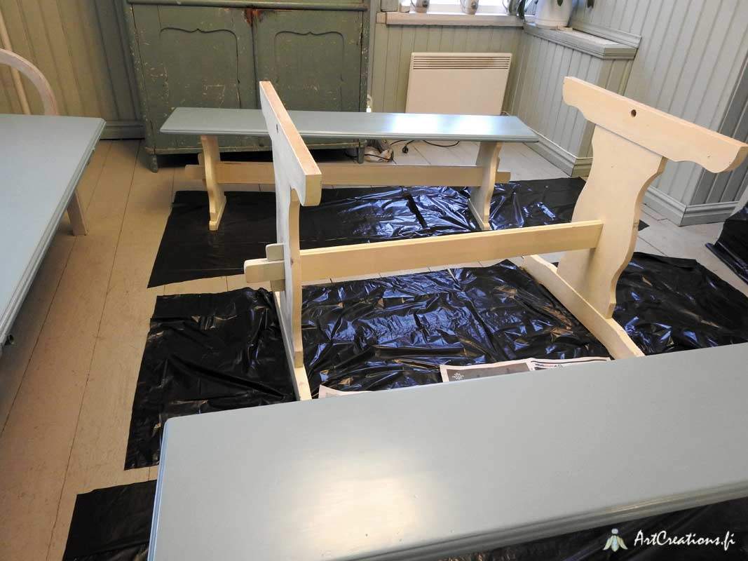 Harmaat jalat olivat hiukan eri sävytteiset kuin tavoittelemani penkkisängyn harmaa, mutta sopivat tosi hyvin pöydän ja penkkien pintalevyjen väriin. Loppujen lopuksi olimme tyytyväisiä, vaikka pöytäpinnan maalaaminen olikin haasteellista. Hyvän pensselin sijaan olisikin ollut paikallaan ostaa tela maalin levitykseen isoille pinnoille. Maalipensselillä en ehtinyt levittää maalia tarpeeksi nopeasti laajalle alueelle, maalin pinta kuivui sen verran nopeasti, ettei tuoretta pintaa ja jo levitettyä maalia saanut aivan tasaisesti ilman pensselin jälkiä. Penkit sen sijaan olivat pienempiä pintoja, ja ne ehdin maalata kerralla tasaisesti.