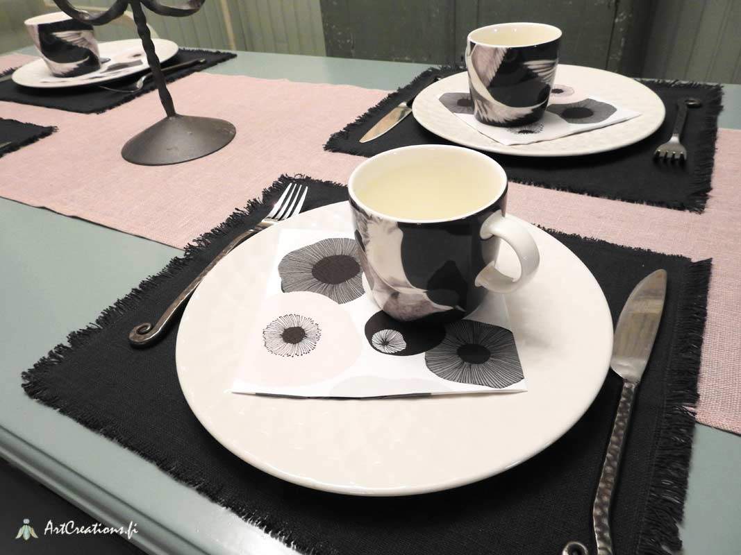 Haeskelimme Heidin kanssa tekstiilejä, jotka sopisivat kuppeihin, pöytään ja tupakeittiömme väreihin. Niitä olikin vaikea löytää. Päädyimme lopulta liinoihin, jotka vaikuttivat väreihin sopivilta. Kun sitten kokeilin niitä pöytään, minun täytyi vähän muuttaa ajatusta, ja tein mustasta kaitaliinasta neljä tablettia. Ne sopivat vaaleanpunaisen kaitaliinan, kuppien ja lautasten kanssa oikein hyvin.